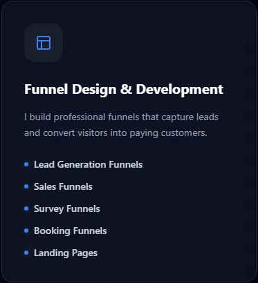 I build the funnel, set up the CRM, and implement all automation systems inside GHL.